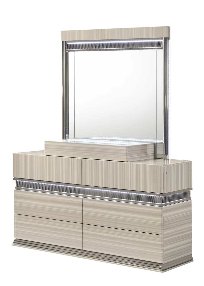 The Carrara Bedroom Collection by Masa Furniture is a stunning fusion of modern architecture and high-glamour design, crafted to turn your master suite into a luminous retreat. Finished in a sophisticated light-grey wood grain with a high-gloss sheen, this set uses light and texture to create an atmosphere of contemporary luxury.