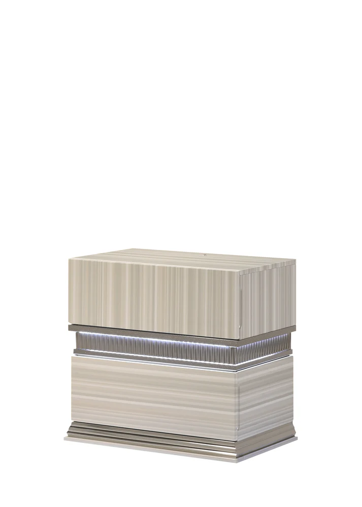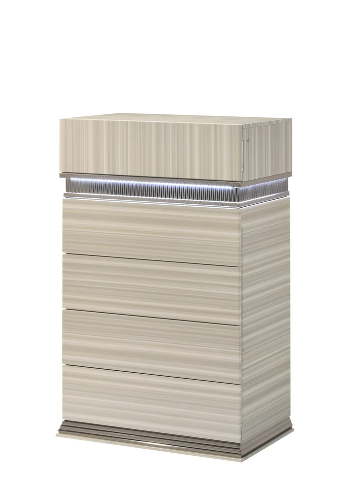 - Modern Functionality: Spacious storage drawers throughout the collection feature smooth-gliding hardware and polished silver bases for added durability and style.