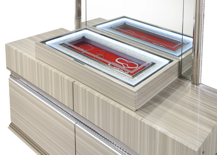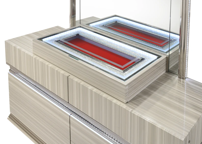 - Signature Jewelry Drawer: The dresser features a specialized, top jewelry case with a glass viewing top, bright LED internal lighting, and a vibrant red felt lining to elegantly organize and display your valuables.