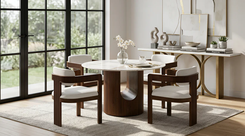• Architectural Interest: The fluted textures on both the table and chairs create a cohesive, rhythmic visual flow.