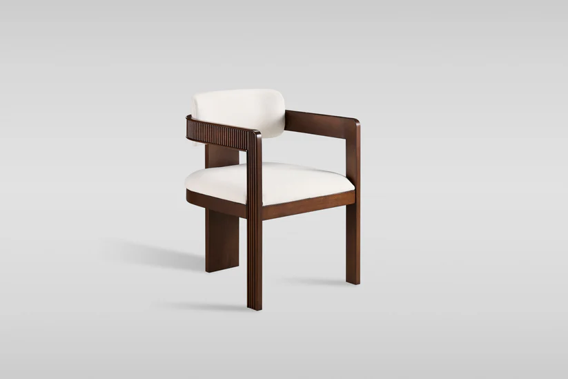 Designed to complement the table’s rhythmic lines, the Becky Chair is a feat of contemporary woodworking. Crafted from solid birch wood in a deep walnut finish, it features a wrap-around backrest with matching vertical fluting.